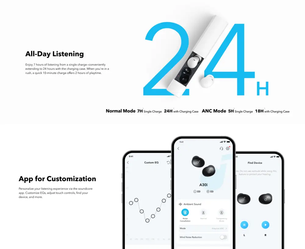 - Clear Sound with 3D Surround Sound Effect: soundcore A30i features composite diaphragms so you can enjoy clear and well-balanced sound. Access the soundcore app to activate the 3D surround sound effect for a more immersive audio experience.
