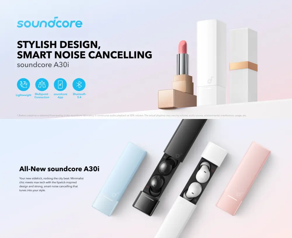 - On-the-Go Design: Featuring a chic lipstick-shaped case that’s all about making a statement, soundcore A30i makes style and comfort a priority. Tiny, lightweight earbuds are ergonomically designed for an optimal fit, while feeling virtually weightless.