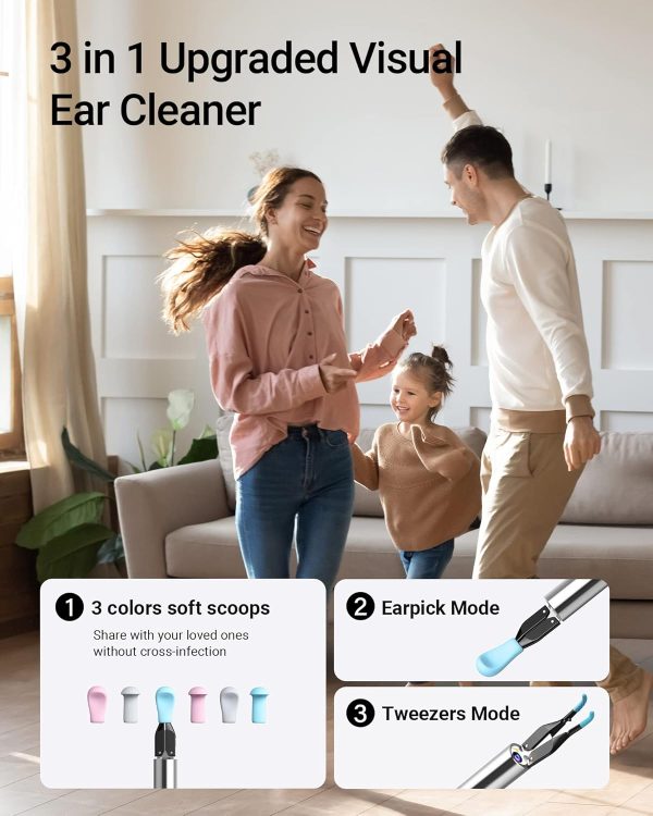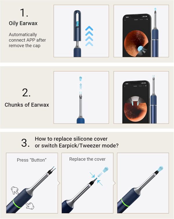 - 3-in-1 Upgraded Visual Ear Wax Removal Tool with Ear Camera – put one of tricolor silicone tips on and clean your ear canal gently. You can also share with your loved ones without cross-infection. Ear tweezers: even large pieces of earwax can be removed by pressing a 360° switch to control the tweezers. Ear endoscope: observe the condition of your ear canal to be assured.