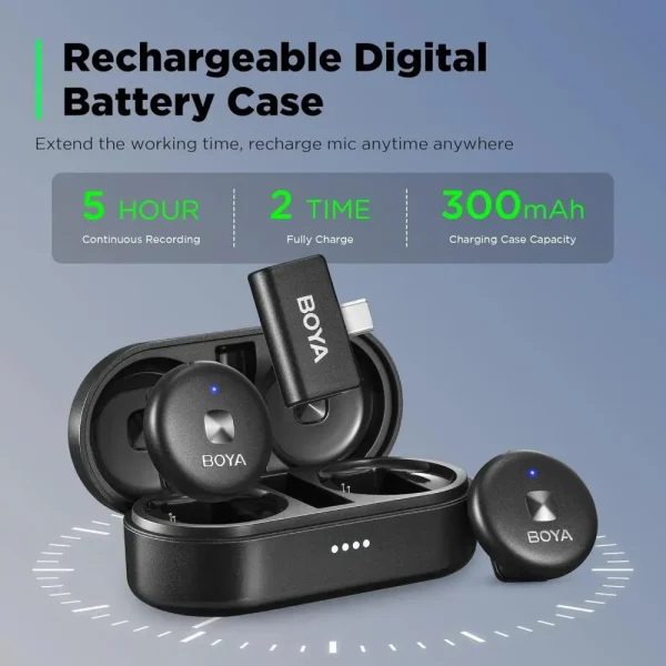 - Portable Charging Case : BOYA Omic-U comes with a charging case. The microphone has a built-in rechargeable lithium battery with a battery life of up to 5 hours, and the charging box can be used for up to 15 hours. You can charge the device through the transmitter while recording without fear of recording interruption.