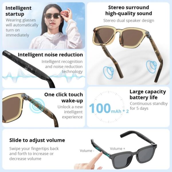 - Immersive Audio with Open-Ear Design:Â The COLMI G06 smart glasses offer a seamless audio experience with an open-ear design that lets you enjoy music, take calls, and stay connected to your surroundings. The discreet built-in speakers deliver rich, clear sound for an immersive experience without the need for earbuds.