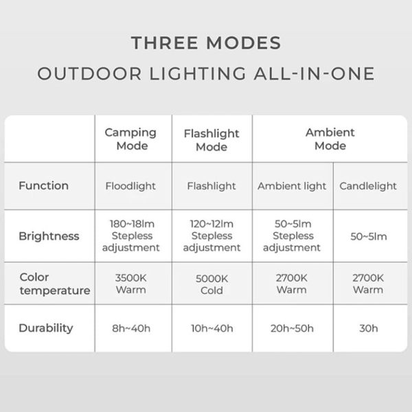 - Versatile 3-in-1 Lighting: Switch between camping light, ambient light, and flashlight modes to suit any situation.