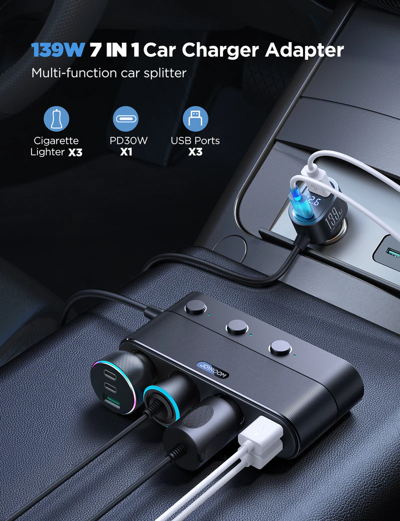 Joyroom Jr-CCL01 139W 7 in 1 Car Cigarette Lighter Adapter With Three Sockets Four Ports Pd+Qc3.0 Usb 3