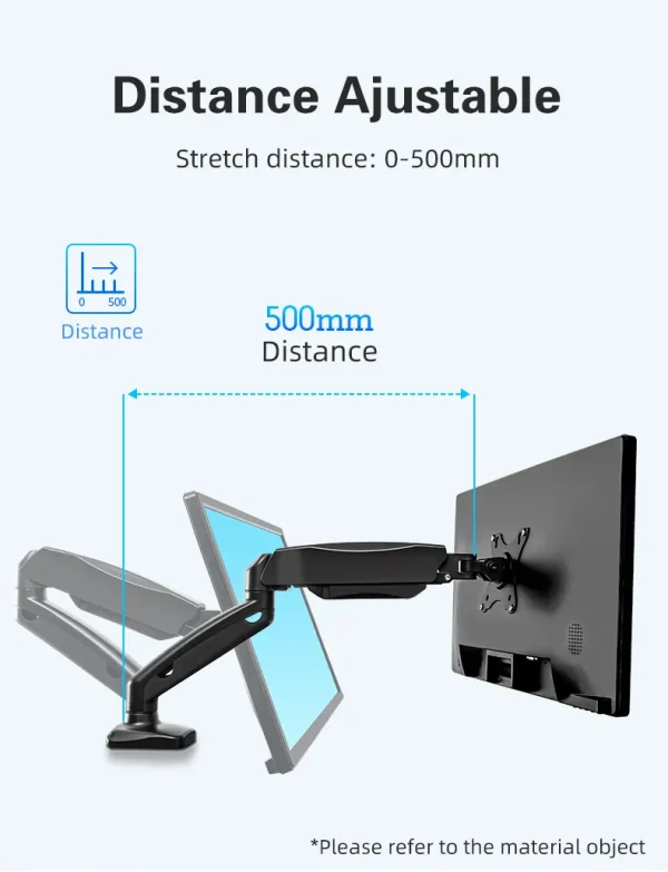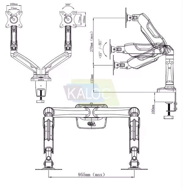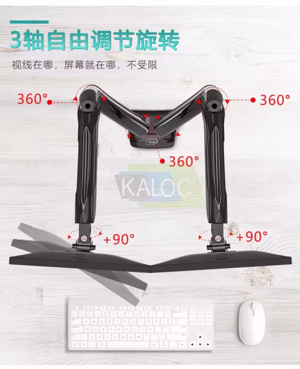 - One of the standout features of the Kaloc KLC V28 is its gas spring arm, allowing for seamless height adjustment of the monitors. The tilt range of -50/+35 degrees enables you to find the optimal viewing angle, reducing glare and optimizing ergonomic comfort during prolonged use. With an extension length of 500mm, this dual-arm desk mount provides ample flexibility in arranging your monitor setup according to your preferences.