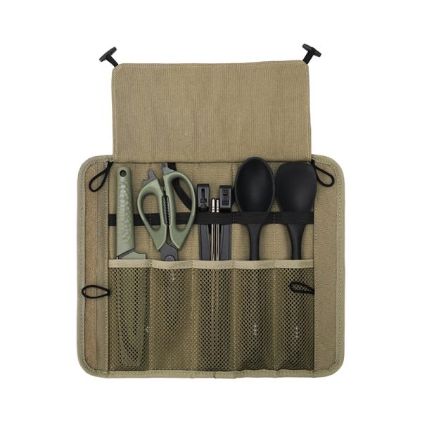 - 6-piece kitchen set: multi-purpose scissors, multi-purpose grill tongs, spatula, spoon, chopsticks, multi-purpose knife, nylon bag