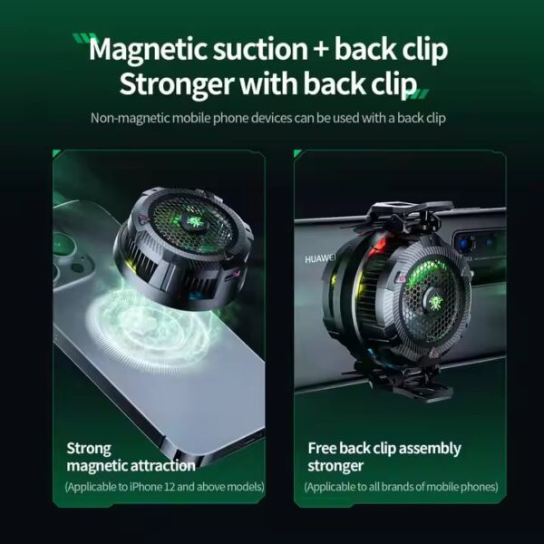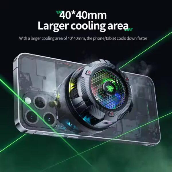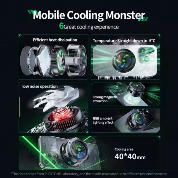 • “Mobile Cooling Monster, 6 New Cooling Experiences Efficient heat dissipation Temperature Straight down to 5°C low-noise operation Strong maggetic attraction RGB ambient lighting effed Cooling area 40*40mm