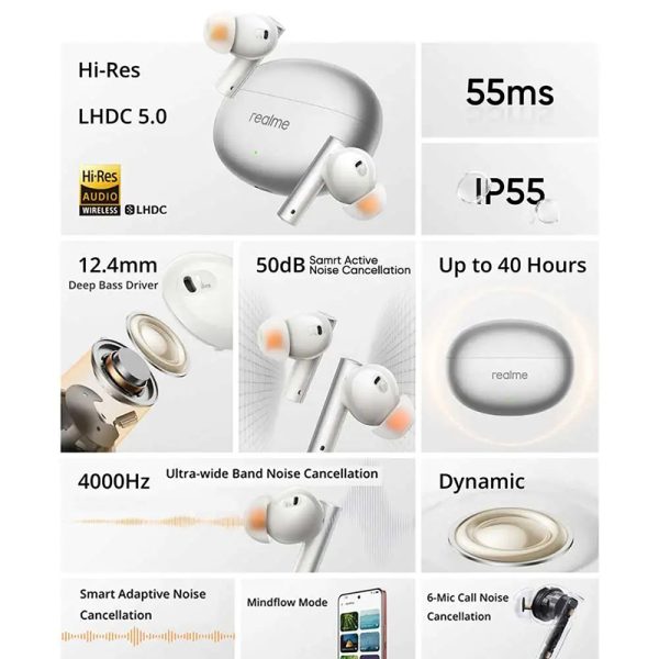 Realme Buds Air 6 TWS Earbuds with 12.4 mm Deep Bass Driver, 40 Hours Play time, Fast Charge,50 dB ANC,LHDC 5.0, 55ms Low Latency, IP55 Dust & Water Resistant, Bluetooth v5.3