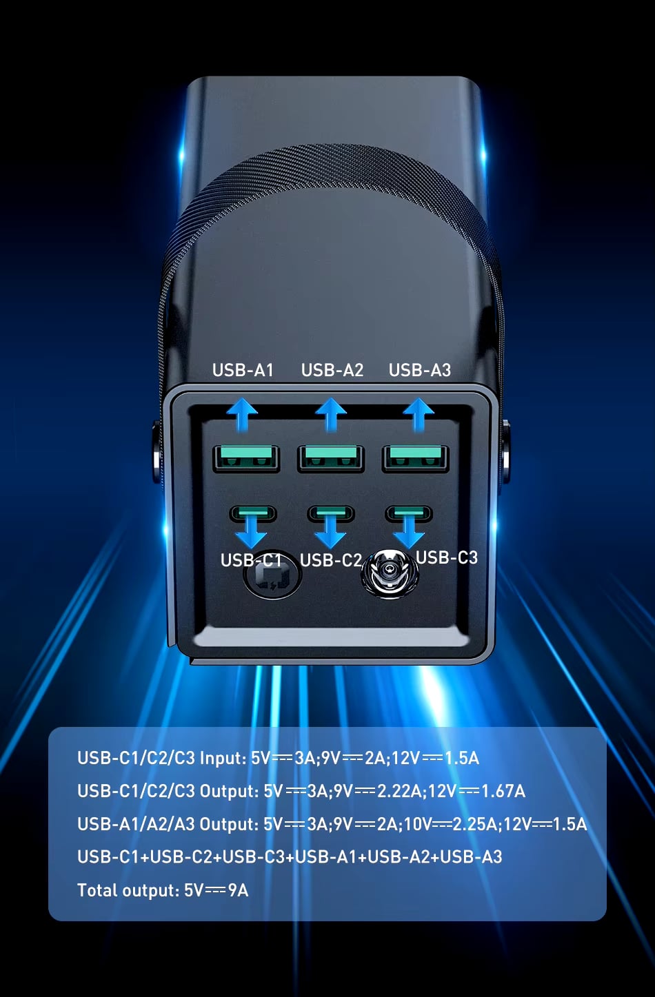 USB-C1+USB-C2+USB-C3+USB-A1+USB-A2+USB-A3 Total Output : 5V/9A