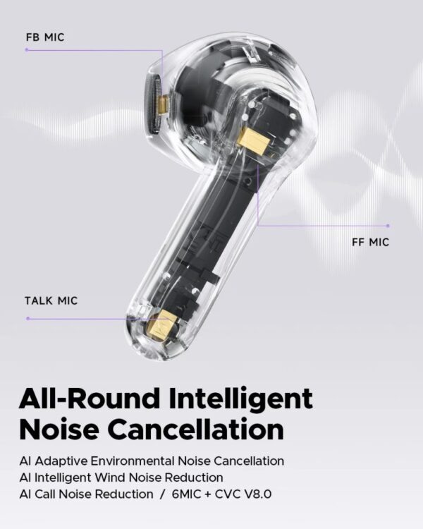 - Intelligent Adaptive AI Noise Reduction Apply the intelligent adaptive AI noise reduction system to detect the usage status in real-time, calculate the noise reduction parameters that match the current environment, and protect against noise more deeply. By adding a windproof woven steel mesh structure, an L-shaped cavity design that weakens wind flow, and a new AI wind noise reduction algorithm, wind noise can be eliminated by up to 90%.