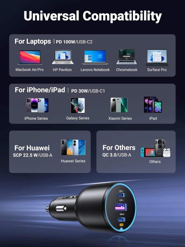 UGREEN 130W USB C Car Charger, PD 100W +PD 30W Type C Car Charger Adapter, Fast Charging Car Charger Compatible with iPhone 16 16 Plus 16 Pro 16 Pro Max, Galaxy S24 S23 Ultra, iPad, MacBook, and More