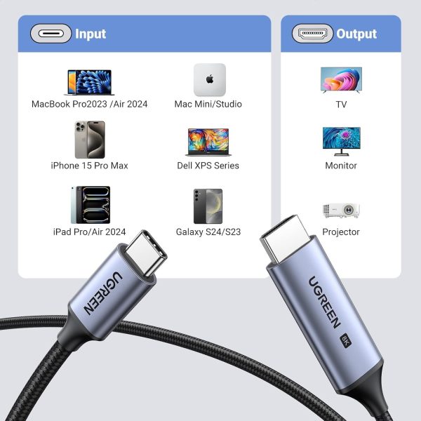 UGREEN USB C to HDMI 2.1 Cable 8K@60Hz 4K@240Hz 6.6FT Thunderbolt 4/3 to HDMI 48Gbps HDR HDCP2.3 Type C to HDMI Cord Compatible for MacBook Pro Air iPad, iPhone 15 Pro Max, Galaxy S24, Pixel 8, XPS 17