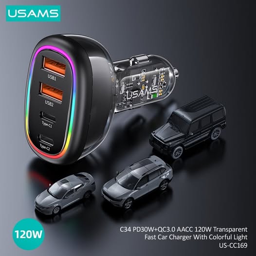 Usams US-CC169 120W 4 Port Transparent Car Charger with Colorful light online in Bangladesh from gimmickbd.com.