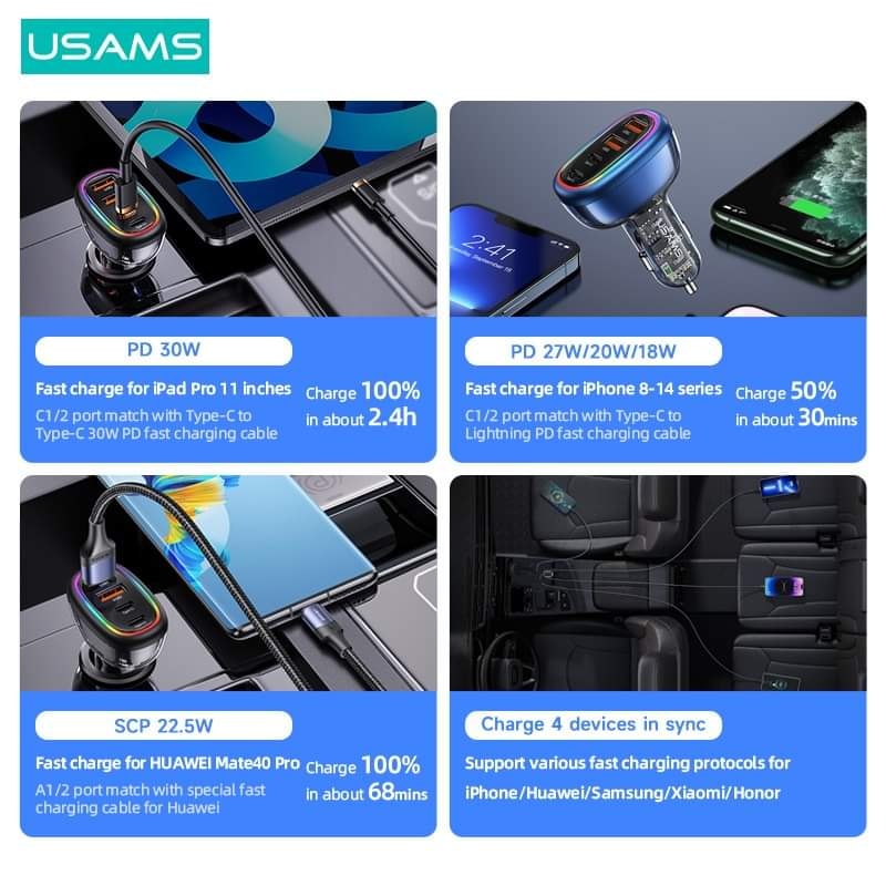 USAMS US-CC169 PD30W+QC3.0 120W 4-port Transparent Car Fast Charger with Colorful Lights