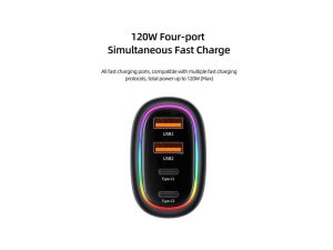 - 4 fast charging ports, each compatible with various brands of fast charging protocols, with a total power of 120W max.