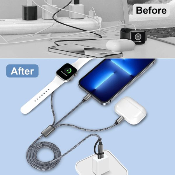 • Multi-Device Charging: Equipped with three connectors—USB-C, Lightning (iP), and Apple Watch charger—allowing you to charge a smartphone, tablet, and Apple Watch concurrently.
