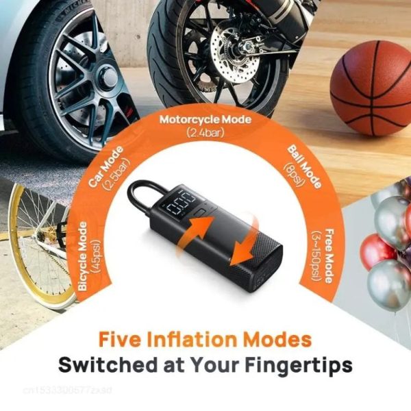 - Versatile Inflation Modes & Nozzle Options – This wireless air pump has 5 modes and 3 nozzles to suit different inflation needs for car tires, bikes, motorcycles, balls and more. You can choose between BAR and PSI units for easy reading.