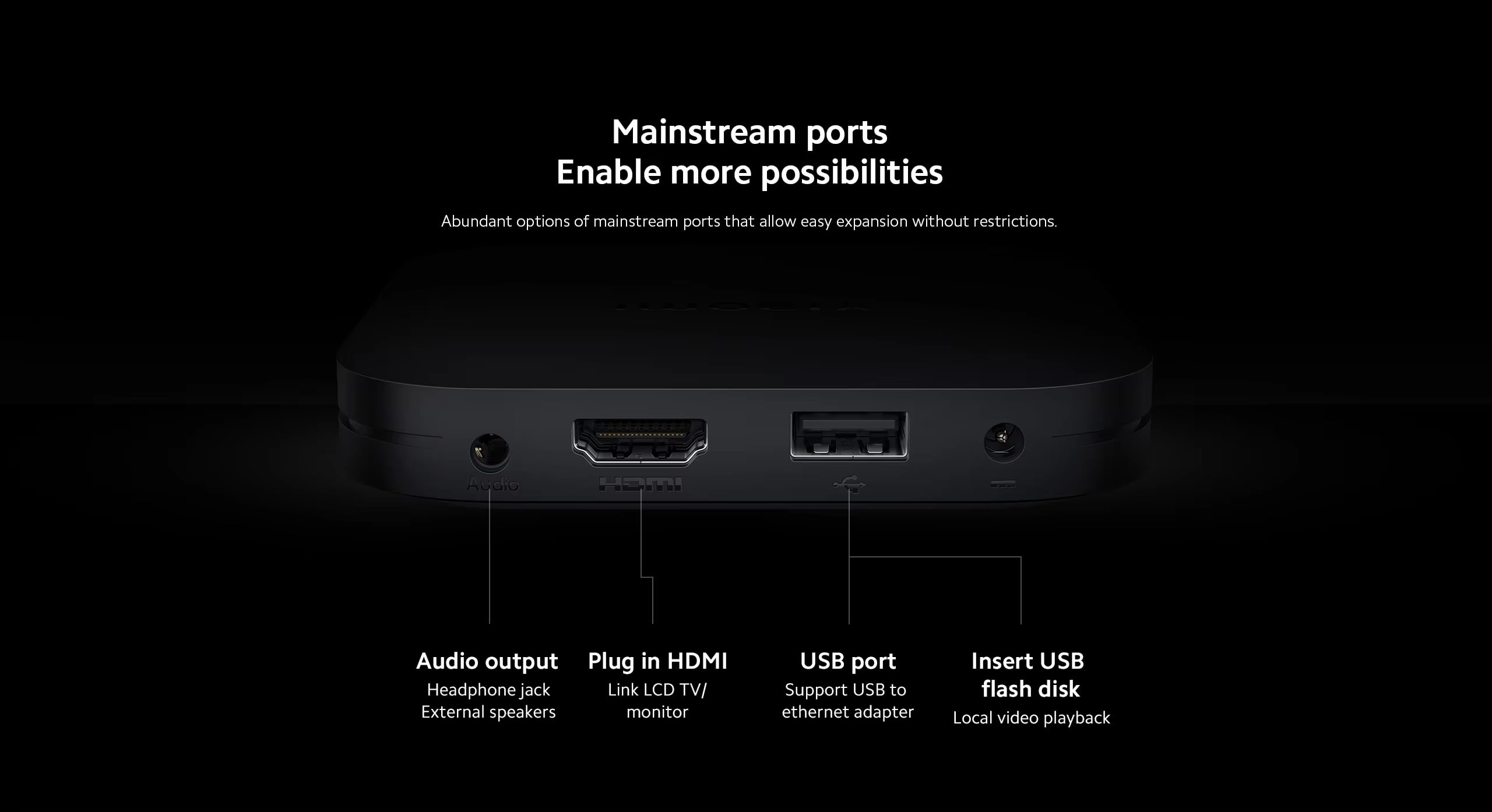 Mainstream Ports:Â Xiaomi TV Box S 2nd Gen 4K Ultra HD Streaming Media Player comes with abundant options of mainstream ports that allow easy expansion without restrictions. It comes with 1x HDMI 2.1, 1x USB 2.0 and 1x Audio output.