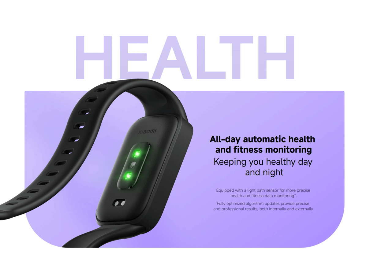 - Moreover, the Smart Band 9 Active offers 50 fitness modes for versatile activity tracking. It also includes essential health monitoring features such as heart rate monitoring, SpO₂ tracking, sleep analysis, women’s health management, and stress measurement. However, it’s worth noting these features are for personal reference only and not intended for medical use.
